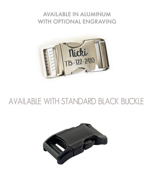 - Two buckle options: A curved black side release buckle or a polished aluminum buckle with optional laser engraving