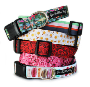 This dog collar was inspired by a tablecloth we saw in a flower shop in Paris. It is part of our French Flower Shop Collection. Made in the USA.