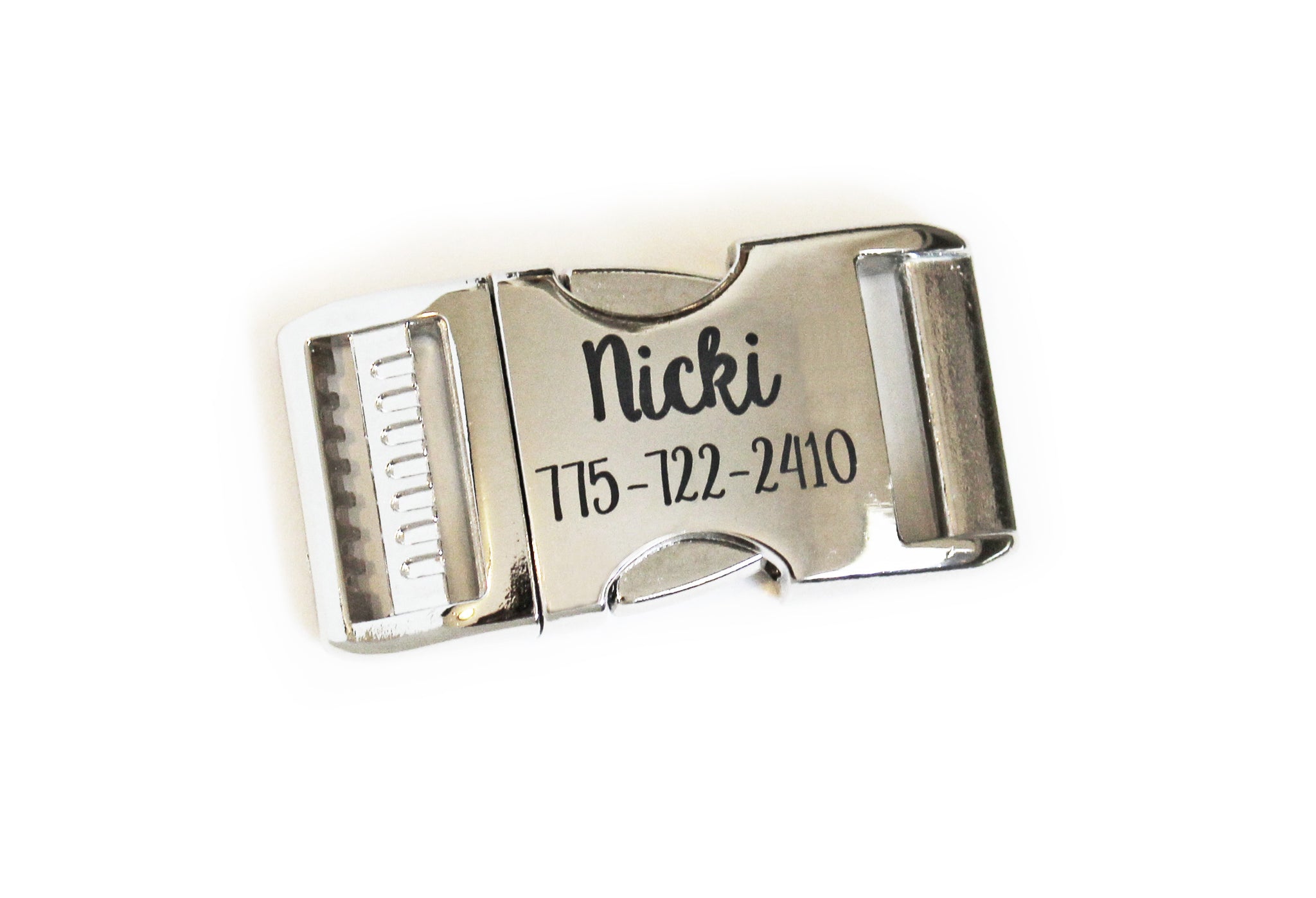 Keep your pet safe and add a polished look to your pup's collar with this laser-engraved aluminum buckle. These aluminum buckles are significantly stronger than plastic, and they will not rust. This upgrade also includes a matching aluminum slider. Available for 5/8", 3/4", 1" and 1.5" width collars.